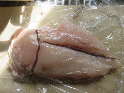 ラップ越しにマジックで書いたとおり・・ ムネ肉をひっくり返すと、カブト虫の背中みたいな感じで筋というのか? 繊維のつなぎ目が見えます。 こんな感じで三分割に切り分けます。 また、ラップ越しにマジックで書きますが・・ よく見ると、繊維が見えます。…
